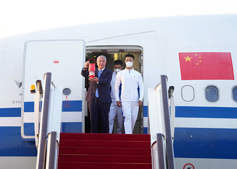 On October 20, at Beijing Capital Airport, Yu Zaiqing (left), Special Representative of the Beijing Winter Olympic Games Organizing Committee and Vice Chairperson of the Beijing Winter Olympic Games Organizing Committee, walked out of the cabin door with the Olympic Flame Lantern. As the delegation of the Beijing Winter Olympic Games Organizing Committee to Greece arrived at the Capital Airport, the Beijing Olympic Winter Games Tinder arrived in Beijing smoothly. Xinhua News Agency reporter, Zhang Chenlin, photo